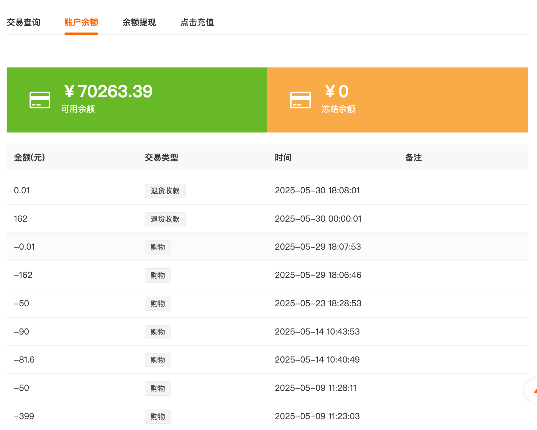 账户余额:可以查看可用余额和冻结余额,交易明细