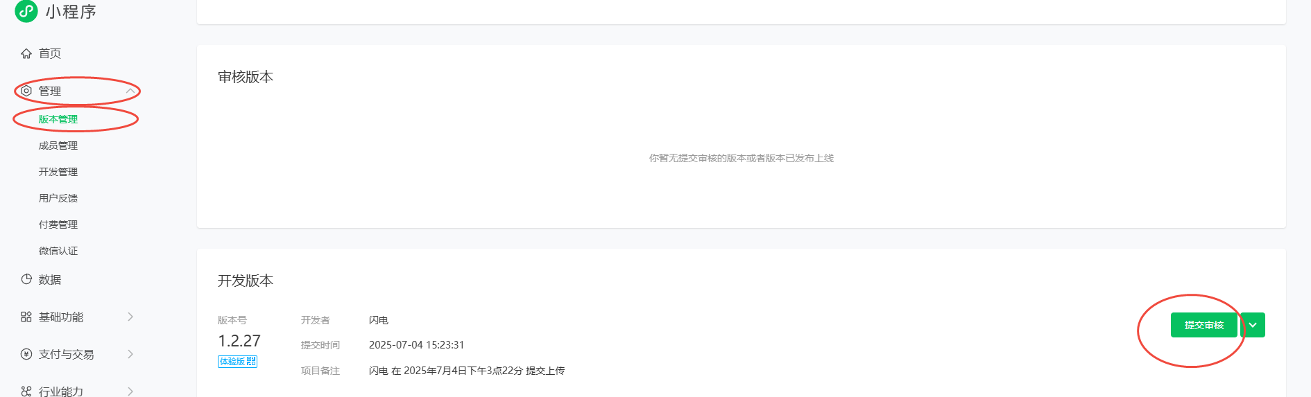 登录小程序后台:管理–版本管理–开发版本 找到最新提交的版本点击“提交审核”-“下一步”-“继续提交”