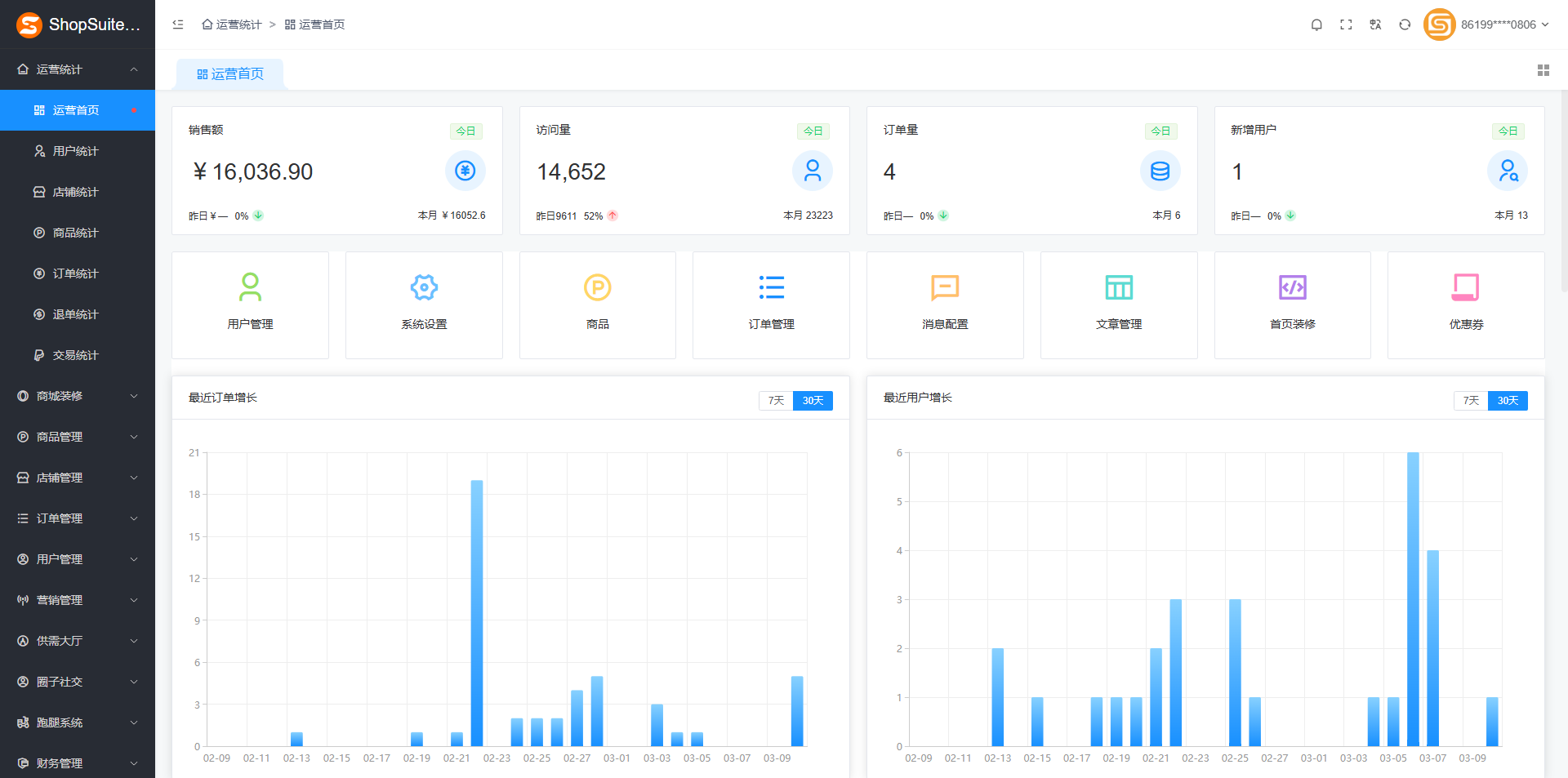 目录 搜索 第一章 前言授权协议免费技术支持商业技术支持第二章 系统安装运行环境要求安装php运行环境安装phpStudy使用宝塔集成环境安装安装SuteShop商城系统解压到网站根目录打开商城系统安装地址安装成功发布管理后台访问SuteShop商城系统第三章 系统平台管理中心运营统计运营首页用户统计店铺统计商品统计订单统计退单统计交易统计商城装修手机装修PC装修页面导航移动首页分类分类导航商品管理商品列表商品分类商品类型商品品牌规格管理辅助属性商品评价店铺管理店铺列表店铺等级店铺分类快递公司市场商圈订单管理在线订单咨询管理售后服务订单评价用户管理用户管理表单数据升级日志会员等级用户标签用户消息用户反馈营销管理单件折优惠券大转盘/砸金蛋拼团砍价加价购秒杀(限时折扣)折上折多件折A+B组合平台秒杀满减满返满即送多倍积分供需大厅采购大厅圈子社交板块管理用户帖子用户评论跑腿系统跑腿设置骑手管理跑腿订单财务管理积分记录发票管理支付渠道提现审核支付会员收支明细充值记录充值卡管理银行卡管理交易订单直播设置直播配置直播商品主播申请推广中心推广员推广订单佣金提现咨询管理文章分类文章管理标签管理文章评论国际化翻译设置货币汇率翻译制作语言系统商城设置站点设置上传设置终端设置接口设置通知设置社交设置IM设置SEO设置财务设置安全设置运营设置推广设置协议设置过滤词汇短信配置保障服务消息模版微信设置反馈类型反馈分类系统管理素材管理地区管理计划任务服务配置清理缓存角色管理系统用户操作日志错误日志第四章 商家管理中心运营统计运营首页商品统计交易统计商品管理添加商品商品列表翻译制作素材管理商品品牌标签管理商品咨询商品评价订单管理在线订单发票管理售后服务订单评价资金管理提现审核我要提现我的账户营销管理单件折优惠券大转盘/砸金蛋平台秒杀多倍积分拼团砍价满返加价购满即送满减折上折多件折秒杀(限时折扣)A+B组合直播设置主播申请直播商品批发市场我要分销店铺设置店铺配置店铺分类消费者保障服务店铺装修基础设置基础资料公司信息部门与员工辅助资料物流管理发货地址物流工具系统设置订单流程第五章 买家中心订单中心我的订单商品评价关注中心商品收藏店铺收藏我的足迹个人中心个人信息账号安全绑定授权收货地址客户服务退款退货商品咨询财产中心账户余额我的优惠券我的积分第六章 支付中心设置支付密码交易查询账户余额余额提现第七章 会员注册第八章 商家入驻第九章 门店管理中心门店订单第十章 供应商管理中心阿里云直播接口配置商城前期需要准备的资料微信支付配置支付宝支付配置域名如何备案苹果个人开发者账号申请发展粉丝常见问题资金流向如何获取小程序各页面链接如何清理浏览器缓存做直播(互动)平台要办什么证?公众号菜单栏如何直接跳转小程序SPU和SKU都是什么意思在线支付购物流程图货到付款购物流程图云版客户前期需要准备的资料拼团流程图如何获取腾讯视频真是播放地址及资源地址微信小程序常见拒绝情形如何更换域名,ip转域名针对随商移动商城系统Hbuilder快速上手发布教程iOS证书(.p12)和描述文件(.mobileprovision)申请http和https互转Android开发者证书的创建PayPal支付配置解决部分服务器自动翻译不起作用Facebook配置互联登陆随商商城采集助手宝塔面板生成更换ssl证书Google配置互联登陆阿里云OSS配置如何安装FFmpeg on CentOS系统缓存切换教程银联在线支付申请配置流程Hbuilder打包h5教程Hbuilder打包app教程小程序配置教程Hbuilder打包微信小程序教程小程序发布审核数据库结构同步域名SSL证书修复,解决小程序网络异常问题地址库导入教程开启积分商品Google Play开发者账号注册腾讯云COS对象存储配置阿里云免费SSL证书申请商品分类导入教程PC VUE前端代码运行&发布定制项目转移教程微信开放平台账号注册及认证百度翻译视频文件存储到阿里云OSS视频文件存储(通过自营店铺图库管理)本地开发环境部署管理后台打包发布阿里云短信开通及备案 暂无相关搜索结果! 本文档使用 MinDoc 发布 运营首页 基础运营数据综合统计及快捷导航文档更新时间: 2025-03-17 15:01 作者:随商信息技术(上海)有限公司