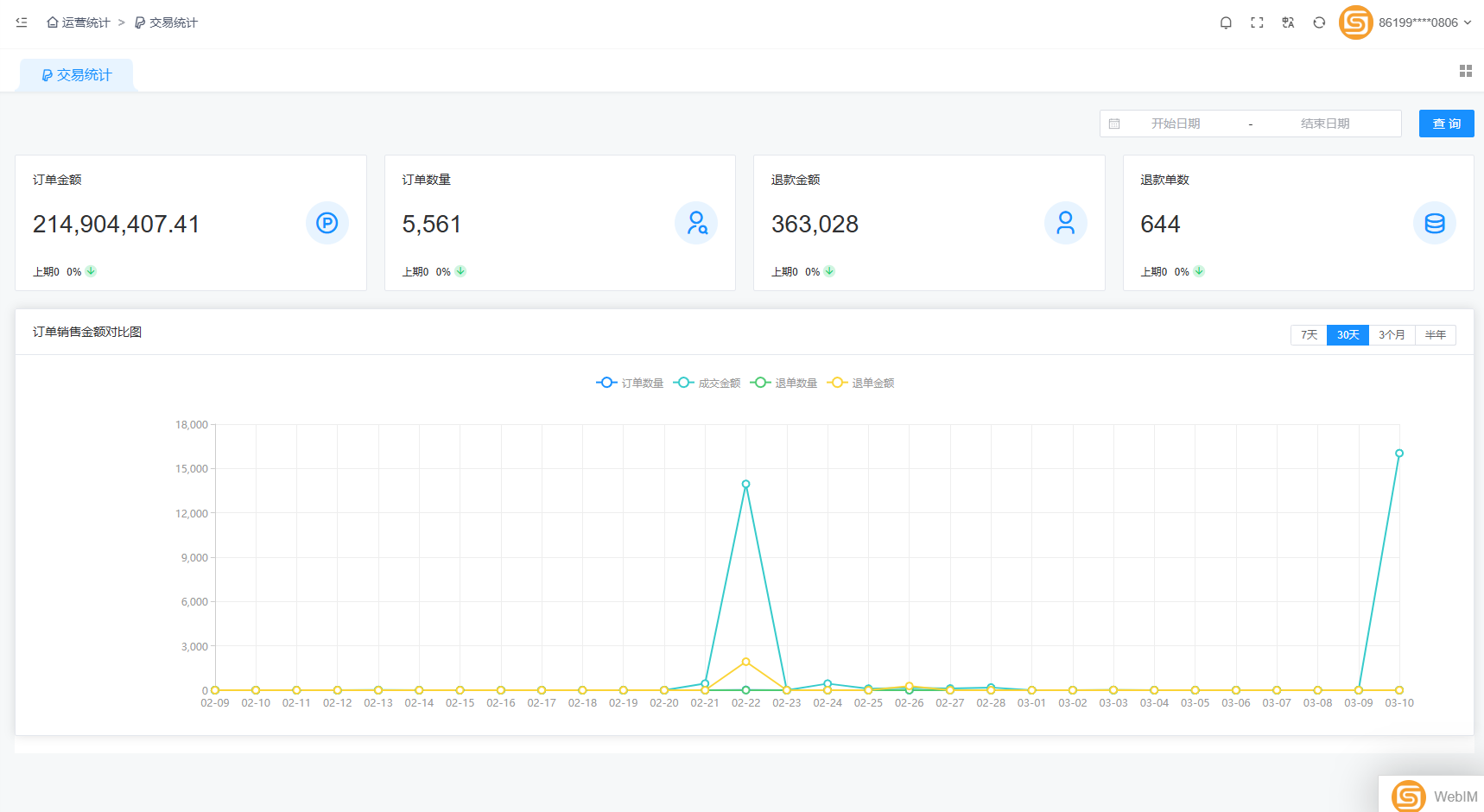 目录 搜索 第一章 前言授权协议免费技术支持商业技术支持第二章 系统安装运行环境要求安装php运行环境安装phpStudy使用宝塔集成环境安装安装SuteShop商城系统解压到网站根目录打开商城系统安装地址安装成功发布管理后台访问SuteShop商城系统第三章 系统平台管理中心运营统计运营首页用户统计店铺统计商品统计订单统计退单统计交易统计商城装修手机装修PC装修页面导航移动首页分类分类导航商品管理商品列表商品分类商品类型商品品牌规格管理辅助属性商品评价店铺管理店铺列表店铺等级店铺分类快递公司市场商圈订单管理在线订单咨询管理售后服务订单评价用户管理用户管理表单数据升级日志会员等级用户标签用户消息用户反馈营销管理单件折优惠券大转盘/砸金蛋拼团砍价加价购秒杀(限时折扣)折上折多件折A+B组合平台秒杀满减满返满即送多倍积分供需大厅采购大厅圈子社交板块管理用户帖子用户评论跑腿系统跑腿设置骑手管理跑腿订单财务管理积分记录发票管理支付渠道提现审核支付会员收支明细充值记录充值卡管理银行卡管理交易订单直播设置直播配置直播商品主播申请推广中心推广员推广订单佣金提现咨询管理文章分类文章管理标签管理文章评论国际化翻译设置货币汇率翻译制作语言系统商城设置站点设置上传设置终端设置接口设置通知设置社交设置IM设置SEO设置财务设置安全设置运营设置推广设置协议设置过滤词汇短信配置保障服务消息模版微信设置反馈类型反馈分类系统管理素材管理地区管理计划任务服务配置清理缓存角色管理系统用户操作日志错误日志第四章 商家管理中心运营统计运营首页商品统计交易统计商品管理添加商品商品列表翻译制作素材管理商品品牌标签管理商品咨询商品评价订单管理在线订单发票管理售后服务订单评价资金管理提现审核我要提现我的账户营销管理单件折优惠券大转盘/砸金蛋平台秒杀多倍积分拼团砍价满返加价购满即送满减折上折多件折秒杀(限时折扣)A+B组合直播设置主播申请直播商品批发市场我要分销店铺设置店铺配置店铺分类消费者保障服务店铺装修基础设置基础资料公司信息部门与员工辅助资料物流管理发货地址物流工具系统设置订单流程第五章 买家中心订单中心我的订单商品评价关注中心商品收藏店铺收藏我的足迹个人中心个人信息账号安全绑定授权收货地址客户服务退款退货商品咨询财产中心账户余额我的优惠券我的积分第六章 支付中心设置支付密码交易查询账户余额余额提现第七章 会员注册第八章 商家入驻第九章 门店管理中心门店订单第十章 供应商管理中心阿里云直播接口配置商城前期需要准备的资料微信支付配置支付宝支付配置域名如何备案苹果个人开发者账号申请发展粉丝常见问题资金流向如何获取小程序各页面链接如何清理浏览器缓存做直播(互动)平台要办什么证?公众号菜单栏如何直接跳转小程序SPU和SKU都是什么意思在线支付购物流程图货到付款购物流程图云版客户前期需要准备的资料拼团流程图如何获取腾讯视频真是播放地址及资源地址微信小程序常见拒绝情形如何更换域名,ip转域名针对随商移动商城系统Hbuilder快速上手发布教程iOS证书(.p12)和描述文件(.mobileprovision)申请http和https互转Android开发者证书的创建PayPal支付配置解决部分服务器自动翻译不起作用Facebook配置互联登陆随商商城采集助手宝塔面板生成更换ssl证书Google配置互联登陆阿里云OSS配置如何安装FFmpeg on CentOS系统缓存切换教程银联在线支付申请配置流程Hbuilder打包h5教程Hbuilder打包app教程小程序配置教程Hbuilder打包微信小程序教程小程序发布审核数据库结构同步域名SSL证书修复,解决小程序网络异常问题地址库导入教程开启积分商品Google Play开发者账号注册腾讯云COS对象存储配置阿里云免费SSL证书申请商品分类导入教程PC VUE前端代码运行&发布定制项目转移教程微信开放平台账号注册及认证百度翻译视频文件存储到阿里云OSS视频文件存储(通过自营店铺图库管理)本地开发环境部署管理后台打包发布阿里云短信开通及备案 暂无相关搜索结果! 本文档使用 MinDoc 发布 交易统计 文档更新时间: 2025-03-10 16:52 作者:随商信息技术(上海)有限公司