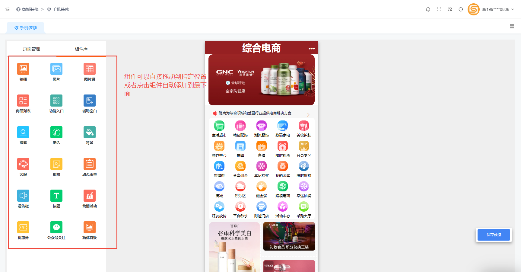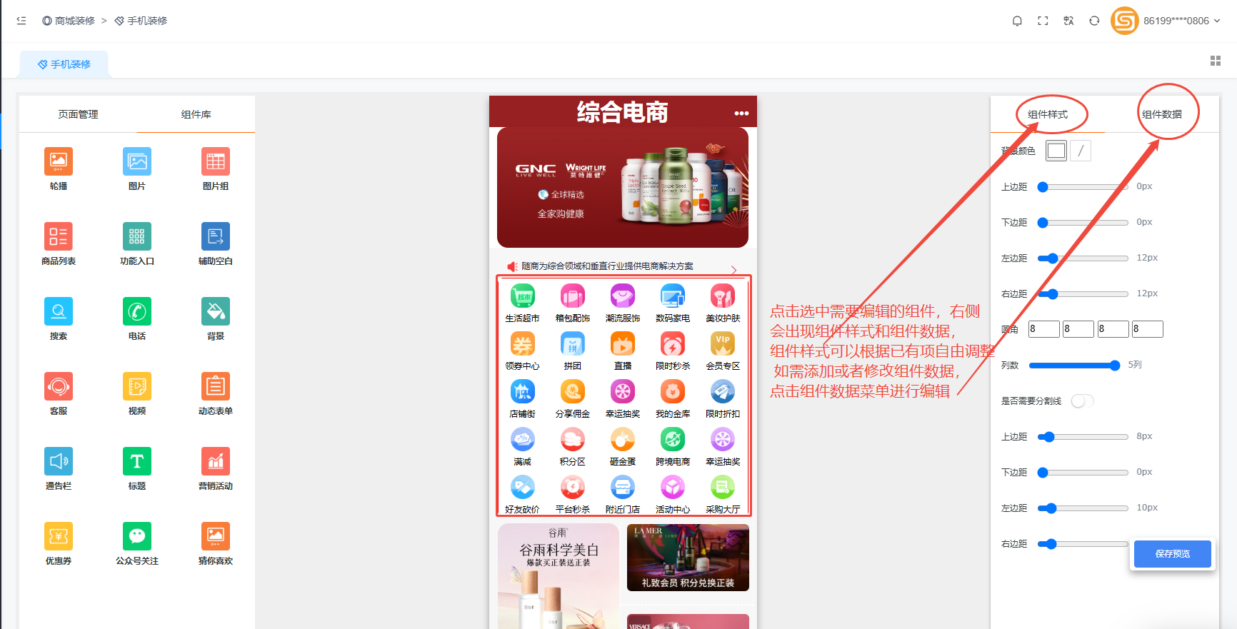这里设置的是商城平台的移动端。选择页面管理列表的应用后,然后进行内容编辑。每个模板里面都有多个组件可用。首页编辑的是否美观全靠个人对各个组件的运用,可多尝试各种组合。