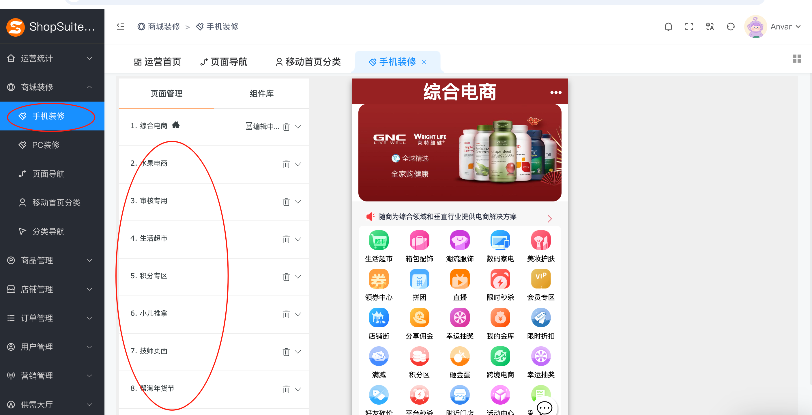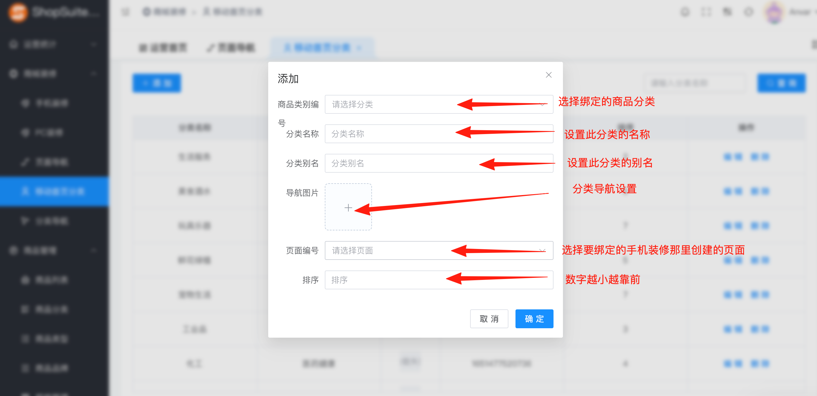添加移动首页分类之前,需要在手机装修那里创建好页面。