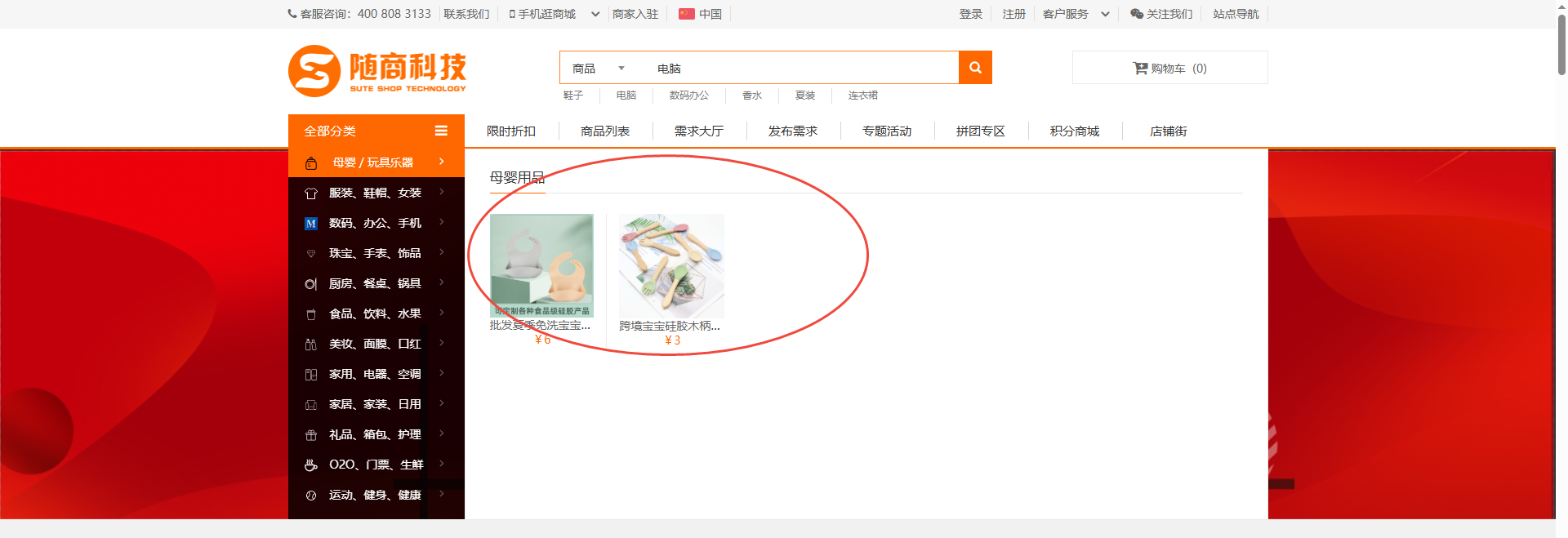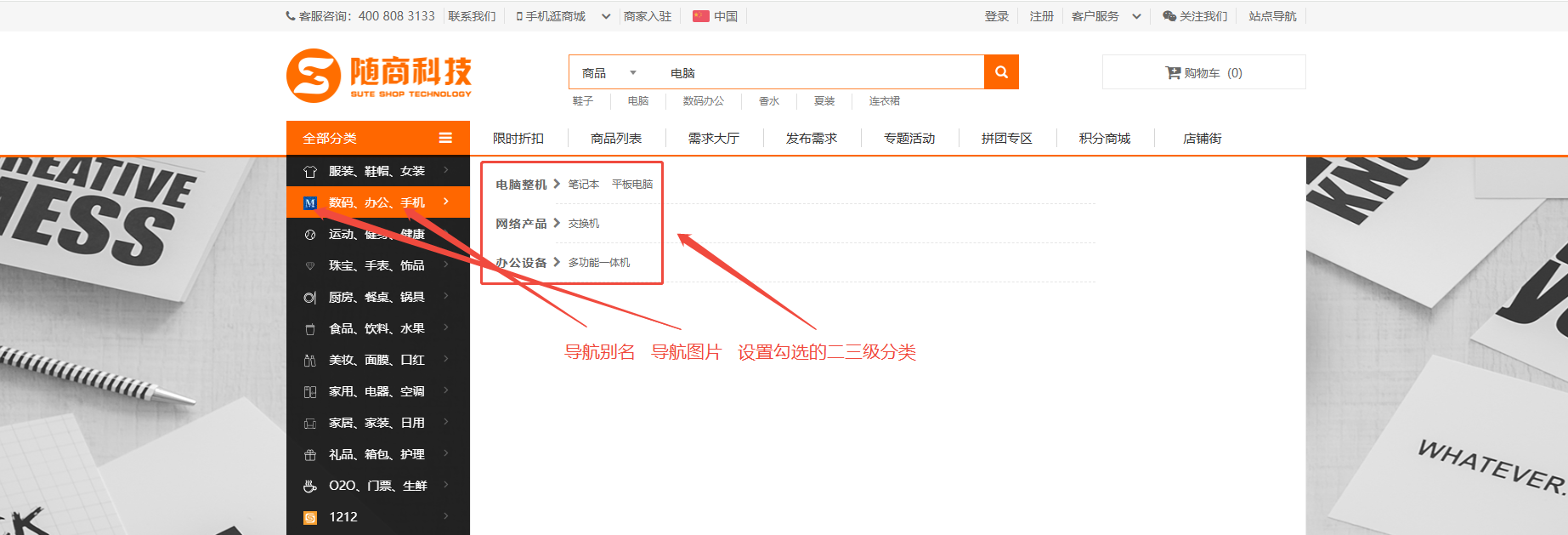 PC首页显示的一级分类可以自定义重命名,这里填写什么前端就会显示什么,二三级分类会按照所勾选的分类展示。