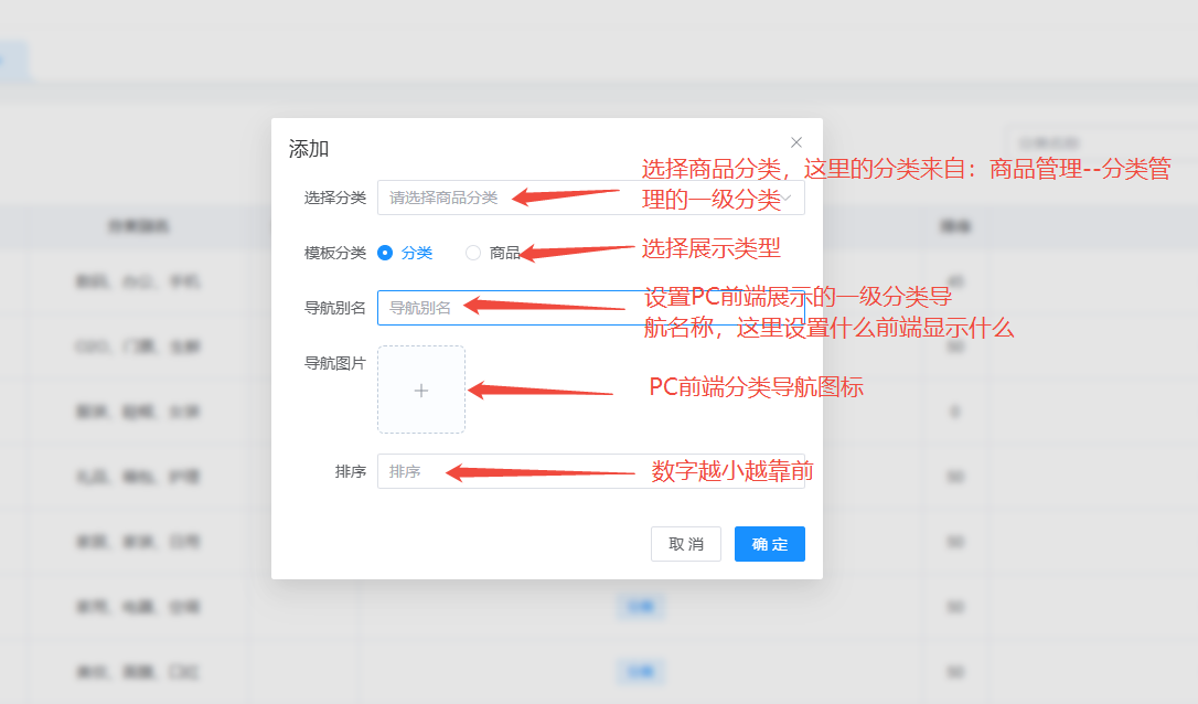 3-1.点击新增按钮新增一级分类导航。前端展示样式:选择商品模板。