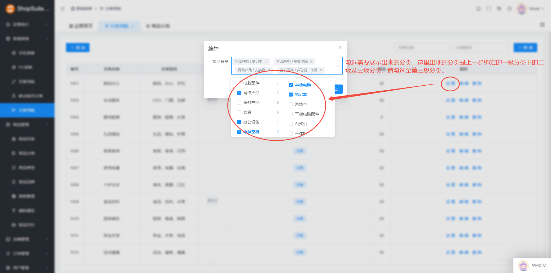 PC 首页的分类显示在此处设置。可以选择性的在PC展示分类。这里只可以选择三级分类。