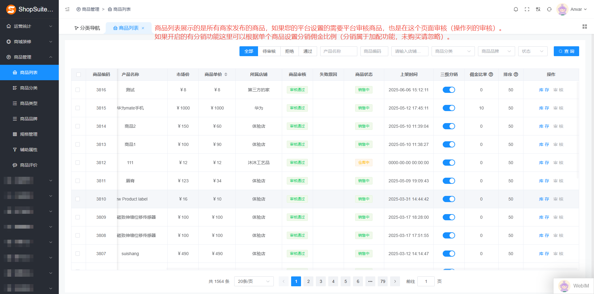 商品列表展示的是平台所有商家发布的商品,如果您的平台设置的需要平台审核商品,也是在这个页面审核(操作列的审核)。如果开启的有分销功能这里可以根据单个商品设置分销佣金比例,开关单个商品是否参与分销,三级分销列置灰既是关闭该商品参与分销,不参与分销的商品购买不会产生佣金(分销属于加配功能,未购买请忽略)文档更新时间: 2025-06-13 14:25 作者:随商信息技术(上海)有限公司