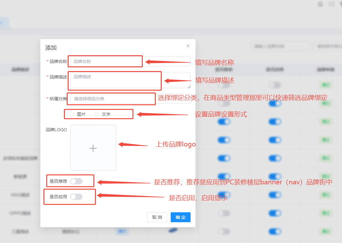添加品牌,然后在商品类型管理里面绑定品牌,然后在分类里面绑定类型,达到品牌关联到分类。店铺在发布商品的时候可以选择关联的品牌。移动端分类中的品牌即可展示关联的商品。