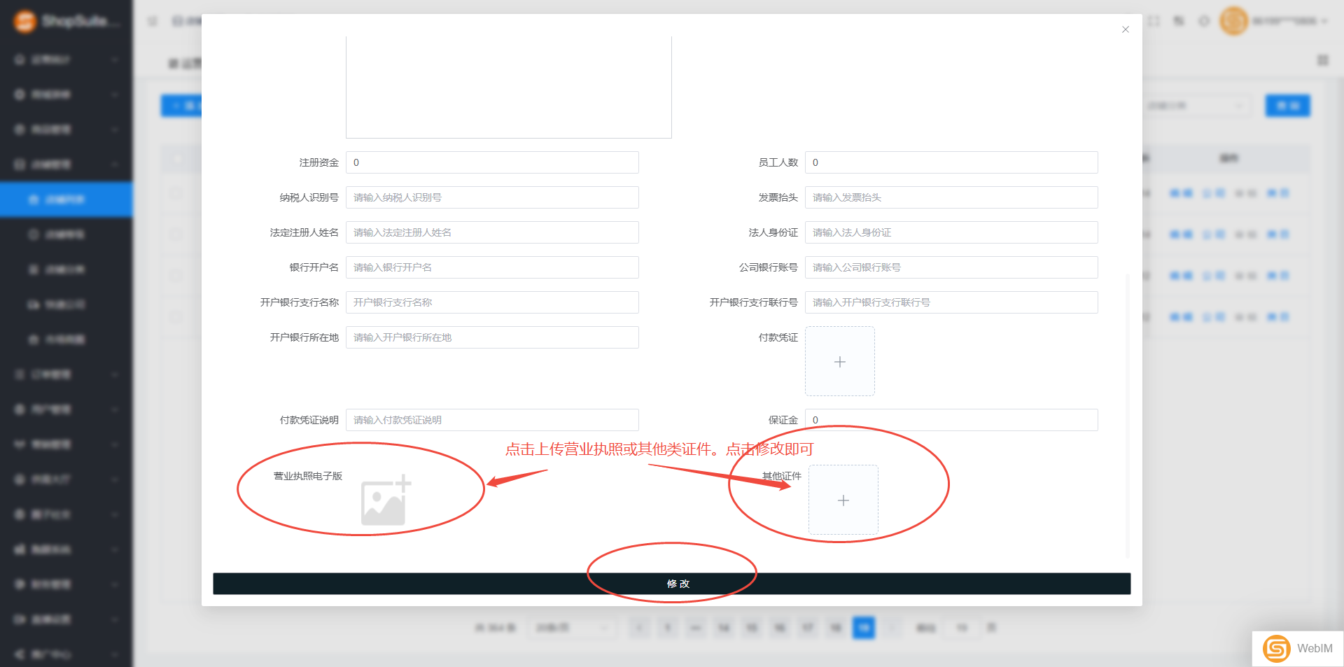 店铺的营业执照是店铺在入驻时候上传的,入驻之后更新营业执照只有平台修改的唯一途径。