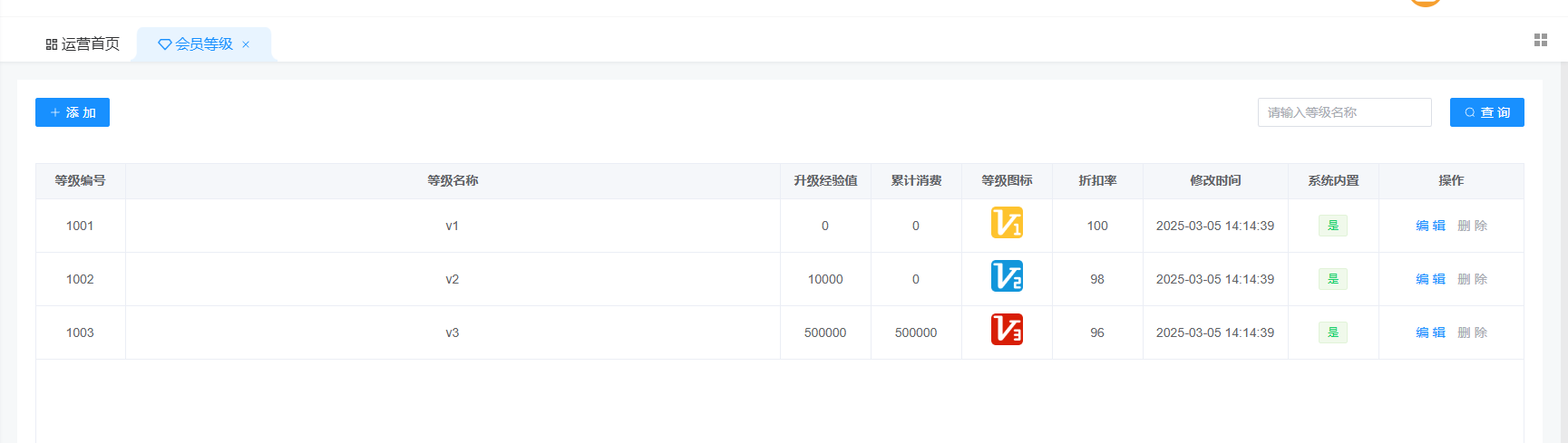 平台会员等级设定 可以设置多级等级,设置每级等级升级条件,还可以设置对应等级享受购物折扣,折扣功能需要单独开启。不开启这里的折扣率不生效。文档更新时间: 2025-07-25 10:07 作者:随商信息技术(上海)有限公司