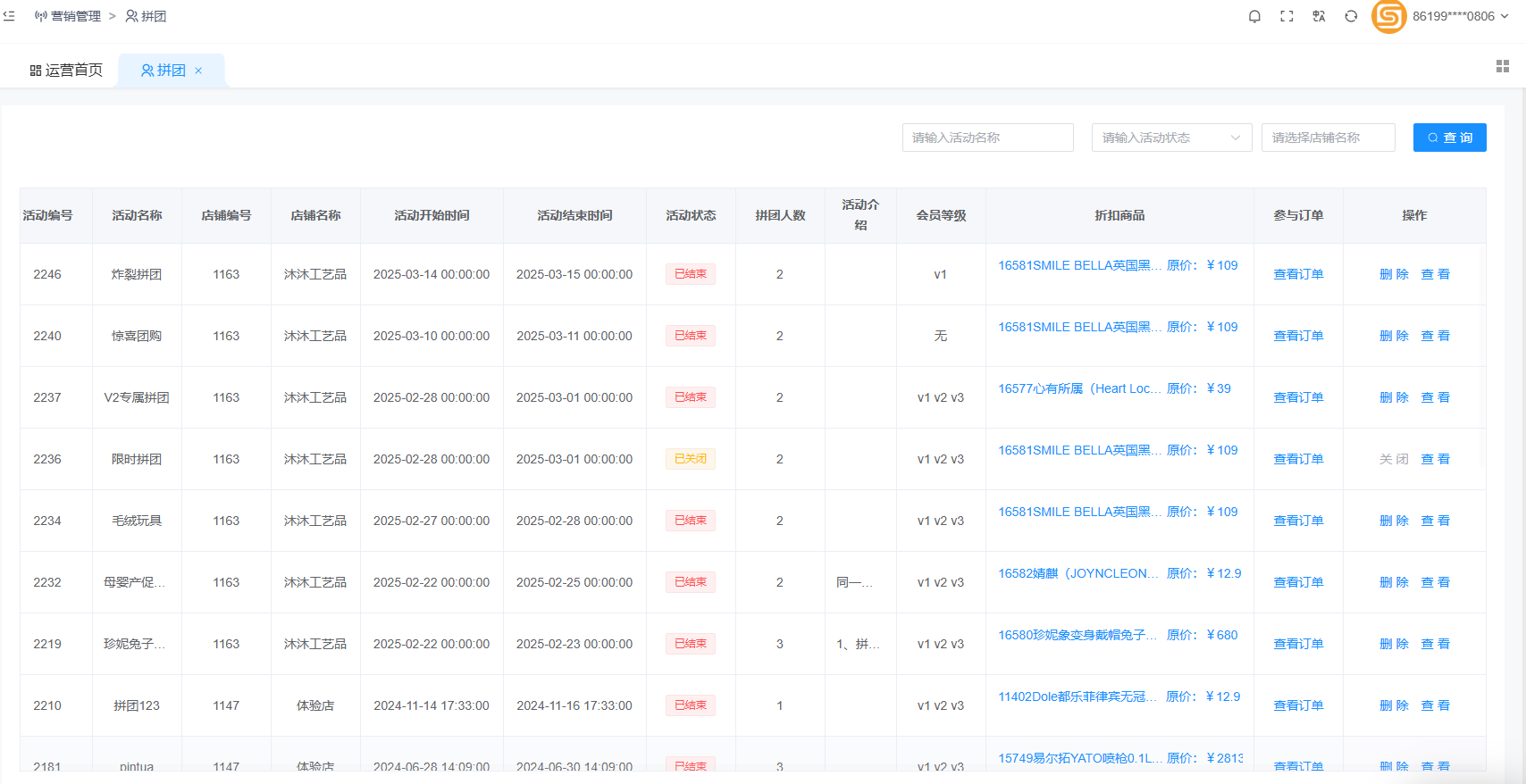 平台所有商家创建的拼团店铺活动 此活动是商家自主发起的活动,平台这里起监管作用,可以查看活动内容和活动情况,发现违规的可以关闭对应的活动。已结束的活动,平台可以删除。 文档更新时间: 2025-07-25 11:01 作者:随商信息技术(上海)有限公司