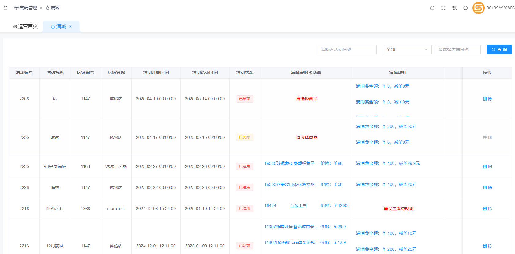 平台所有商家创建的满减店铺活动 此活动是商家自主发起的活动,平台这里起监管作用,可以查看活动内容和活动情况,发现违规的可以关闭对应的活动。已结束的活动,平台可以删除。 文档更新时间: 2025-07-25 11:00 作者:随商信息技术(上海)有限公司