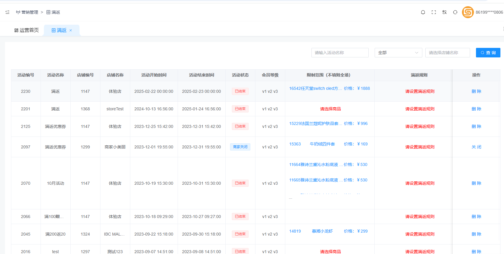 平台所有商家创建的满返店铺活动 此活动是商家自主发起的活动,平台这里起监管作用,可以查看活动内容和活动情况,发现违规的可以关闭对应的活动。已结束的活动,平台可以删除。 文档更新时间: 2025-07-25 11:00 作者:随商信息技术(上海)有限公司