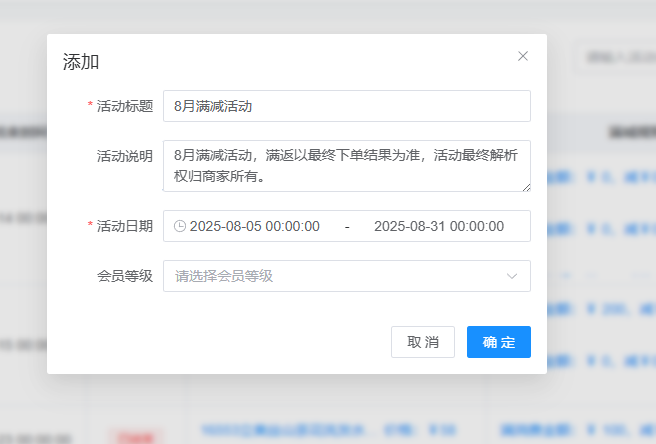 目录 搜索 第一章 前言授权协议免费技术支持商业技术支持第二章 系统安装运行环境要求安装php运行环境安装phpStudy使用宝塔集成环境安装安装SuteShop商城系统解压到网站根目录打开商城系统安装地址安装成功发布管理后台访问SuteShop商城系统第三章 系统平台管理中心运营统计运营首页用户统计店铺统计商品统计订单统计退单统计交易统计商城装修手机装修PC装修页面导航移动首页分类分类导航商品管理商品列表商品分类商品类型商品品牌规格管理辅助属性商品评价店铺管理店铺列表店铺等级店铺分类快递公司市场商圈订单管理在线订单咨询管理售后服务订单评价用户管理用户管理表单数据升级日志会员等级用户标签用户消息用户反馈营销管理单件折优惠券大转盘/砸金蛋拼团砍价加价购秒杀(限时折扣)折上折多件折A+B组合平台秒杀满减满返满即送多倍积分供需大厅采购大厅圈子社交板块管理用户帖子用户评论跑腿系统跑腿设置骑手管理跑腿订单财务管理积分记录发票管理支付渠道提现审核支付会员收支明细充值记录充值卡管理银行卡管理交易订单直播设置直播配置直播商品主播申请推广中心推广员推广订单佣金提现咨询管理文章分类文章管理标签管理文章评论国际化翻译设置货币汇率翻译制作语言系统商城设置站点设置上传设置终端设置接口设置通知设置社交设置IM设置SEO设置财务设置安全设置运营设置推广设置协议设置过滤词汇短信配置保障服务消息模版微信设置反馈类型反馈分类系统管理素材管理地区管理计划任务服务配置清理缓存角色管理系统用户操作日志错误日志第四章 商家管理中心运营统计运营首页商品统计交易统计商品管理添加商品商品列表翻译制作素材管理商品品牌标签管理商品咨询商品评价订单管理在线订单发票管理售后服务订单评价资金管理提现审核我要提现我的账户营销管理单件折优惠券大转盘/砸金蛋平台秒杀多倍积分拼团砍价满返加价购满即送满减折上折多件折秒杀(限时折扣)A+B组合直播设置主播申请直播商品批发市场我要分销店铺设置店铺配置店铺分类消费者保障服务店铺装修基础设置基础资料公司信息部门与员工辅助资料物流管理发货地址物流工具系统设置订单流程第五章 买家中心订单中心我的订单商品评价关注中心商品收藏店铺收藏我的足迹个人中心个人信息账号安全绑定授权收货地址客户服务退款退货商品咨询财产中心账户余额我的优惠券我的积分第六章 支付中心设置支付密码交易查询账户余额余额提现第七章 会员注册第八章 商家入驻第九章 门店管理中心门店订单第十章 供应商管理中心阿里云直播接口配置商城前期需要准备的资料微信支付配置支付宝支付配置域名如何备案苹果个人开发者账号申请发展粉丝常见问题资金流向如何获取小程序各页面链接如何清理浏览器缓存做直播(互动)平台要办什么证?公众号菜单栏如何直接跳转小程序SPU和SKU都是什么意思在线支付购物流程图货到付款购物流程图云版客户前期需要准备的资料拼团流程图如何获取腾讯视频真是播放地址及资源地址微信小程序常见拒绝情形如何更换域名,ip转域名针对随商移动商城系统Hbuilder快速上手发布教程iOS证书(.p12)和描述文件(.mobileprovision)申请http和https互转Android开发者证书的创建PayPal支付配置解决部分服务器自动翻译不起作用Facebook配置互联登陆随商商城采集助手宝塔面板生成更换ssl证书Google配置互联登陆阿里云OSS配置如何安装FFmpeg on CentOS系统缓存切换教程银联在线支付申请配置流程Hbuilder打包h5教程Hbuilder打包app教程小程序配置教程Hbuilder打包微信小程序教程小程序发布审核数据库结构同步域名SSL证书修复,解决小程序网络异常问题地址库导入教程开启积分商品Google Play开发者账号注册腾讯云COS对象存储配置阿里云免费SSL证书申请商品分类导入教程PC VUE前端代码运行&发布定制项目转移教程微信开放平台账号注册及认证百度翻译视频文件存储到阿里云OSS视频文件存储(通过自营店铺图库管理)本地开发环境部署管理后台打包发布阿里云短信开通及备案 暂无相关搜索结果! 本文档使用 MinDoc 发布 满减 满减活动1:创建活动 2:设置活动商品和活动规则 设置活动商品 设置活动规则 活动参与位置:1:平台的所有满减活动列表页:https://test.suteshop.com/h5/pagesub/product/list?activity_type_id=1107&cname=%E6%BB%A1%E5%87%8F文档更新时间: 2025-08-05 15:36 作者:随商信息技术(上海)有限公司