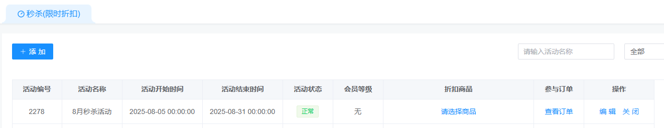 秒杀(限时折扣)活动1:创建活动 2:设置活动商品和活动规则 活动参与位置:1:平台的所有秒杀活动列表页:https://test.suteshop.com/h5/pagesub/product/list?activity_type_id=1103&cname=秒杀文档更新时间: 2025-08-05 16:25 作者:随商信息技术(上海)有限公司