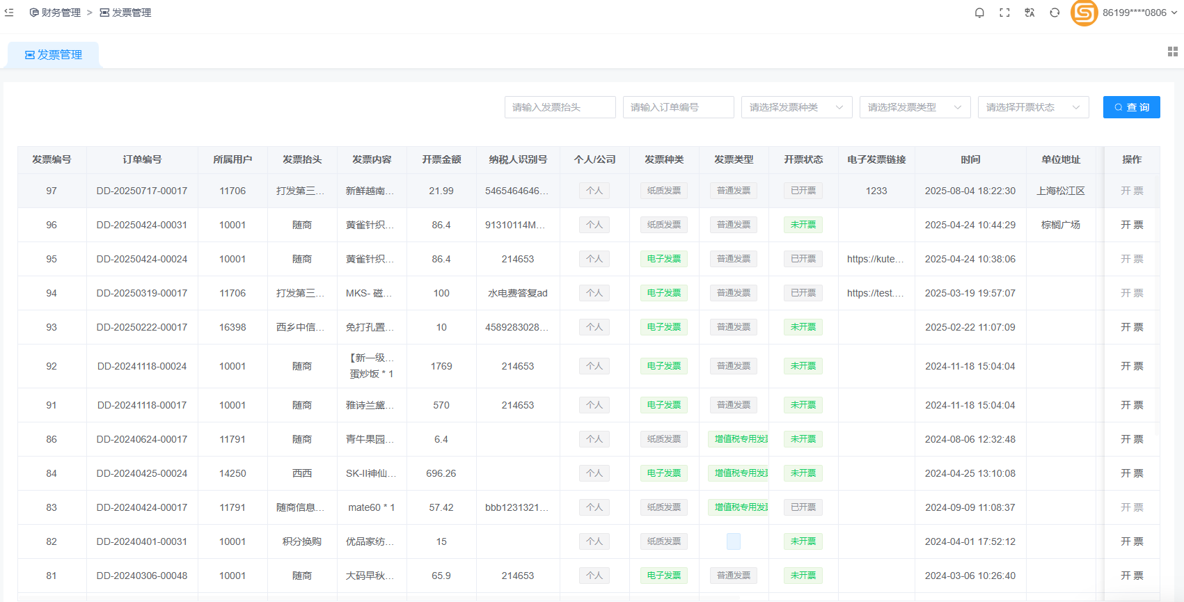 平台所有会员的开票申请。这里平台无需操作。仅是监管,具体开票事宜由对应商家后台操作。