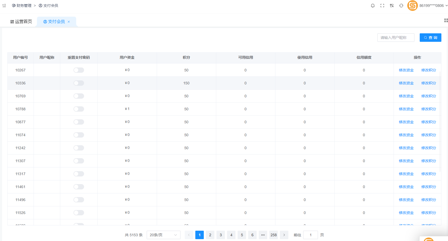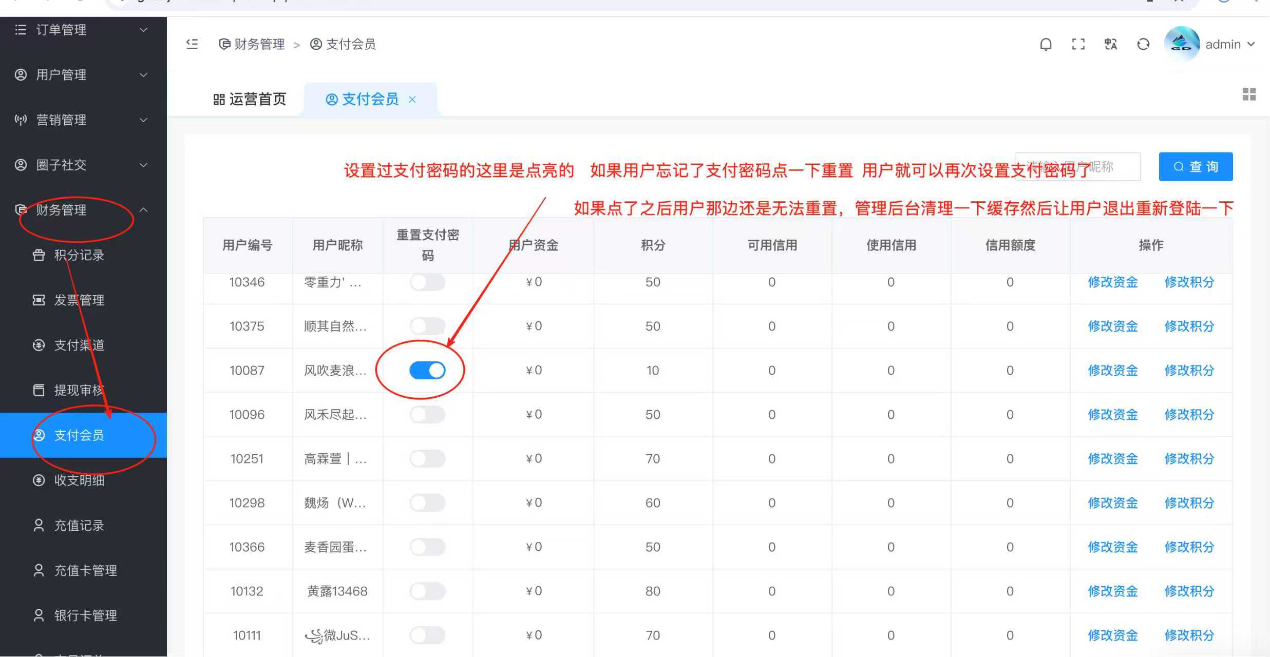 这里可以看到会员的资源数量,通过搜索可以查看具体会员,忘记密码的用户这里可以操作重置支付密码,点击重置后用户即可重新设置支付密码