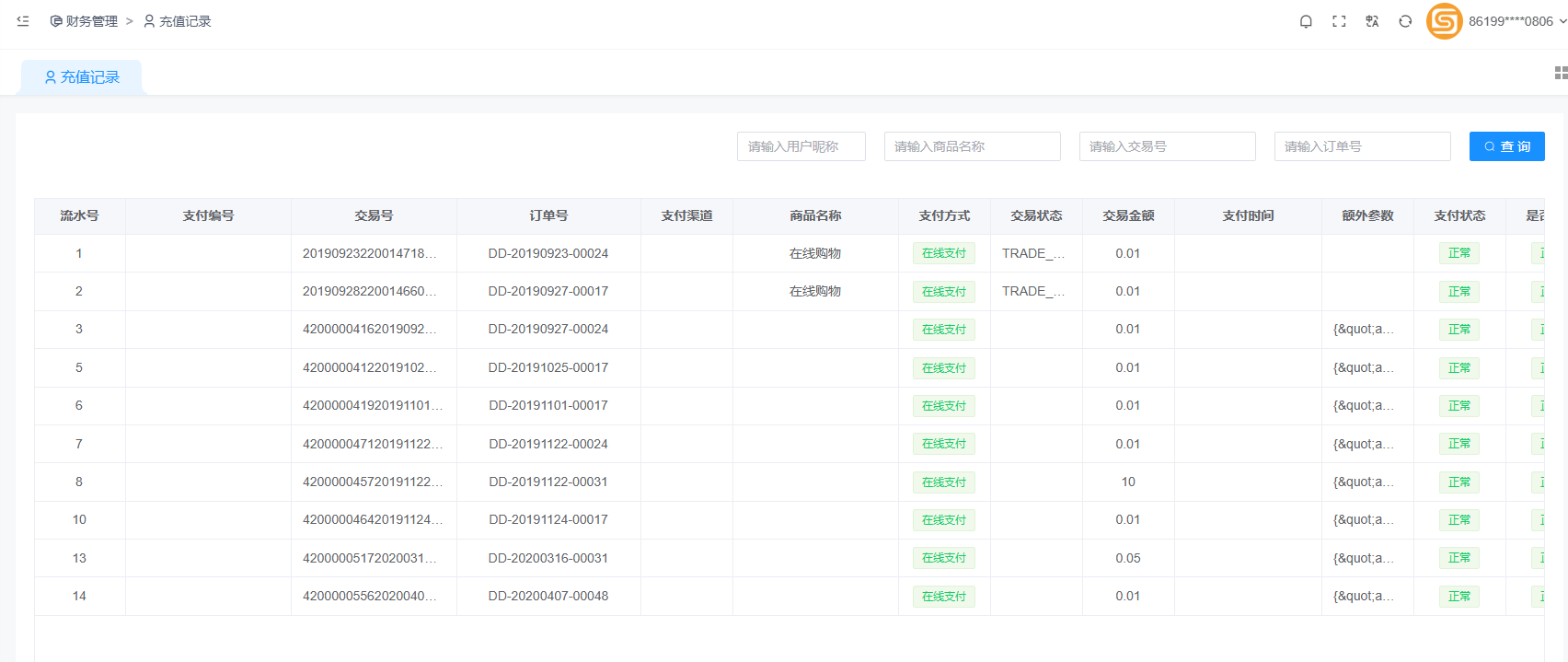 平台所有的交易都是通过系统的余额进行,下单时所选的第三方支付方式都会以客户无感知的方式先进行充值到余额然后再通过余额完成交易流程。这里显示的是记录通过在线支付直接交易的记录,交易号既是交易流水号。只有通过第三方的交易这里才会有记录,如果是使用用户在商城余额交易的这里不记录。