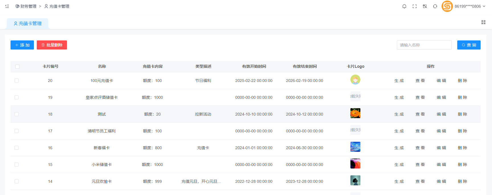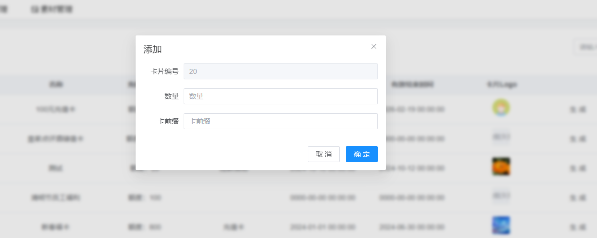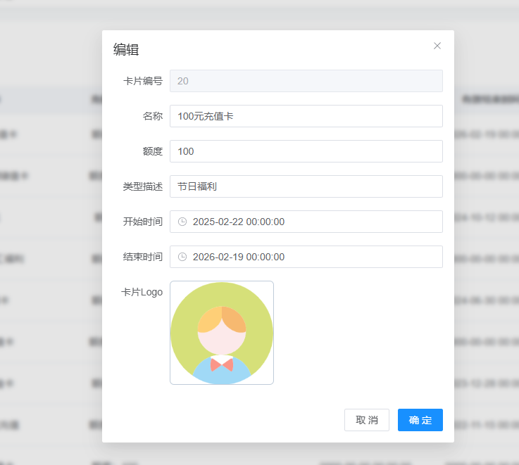 先创建充值卡的名称、额度、描述、开始和结束时间、卡片logo。