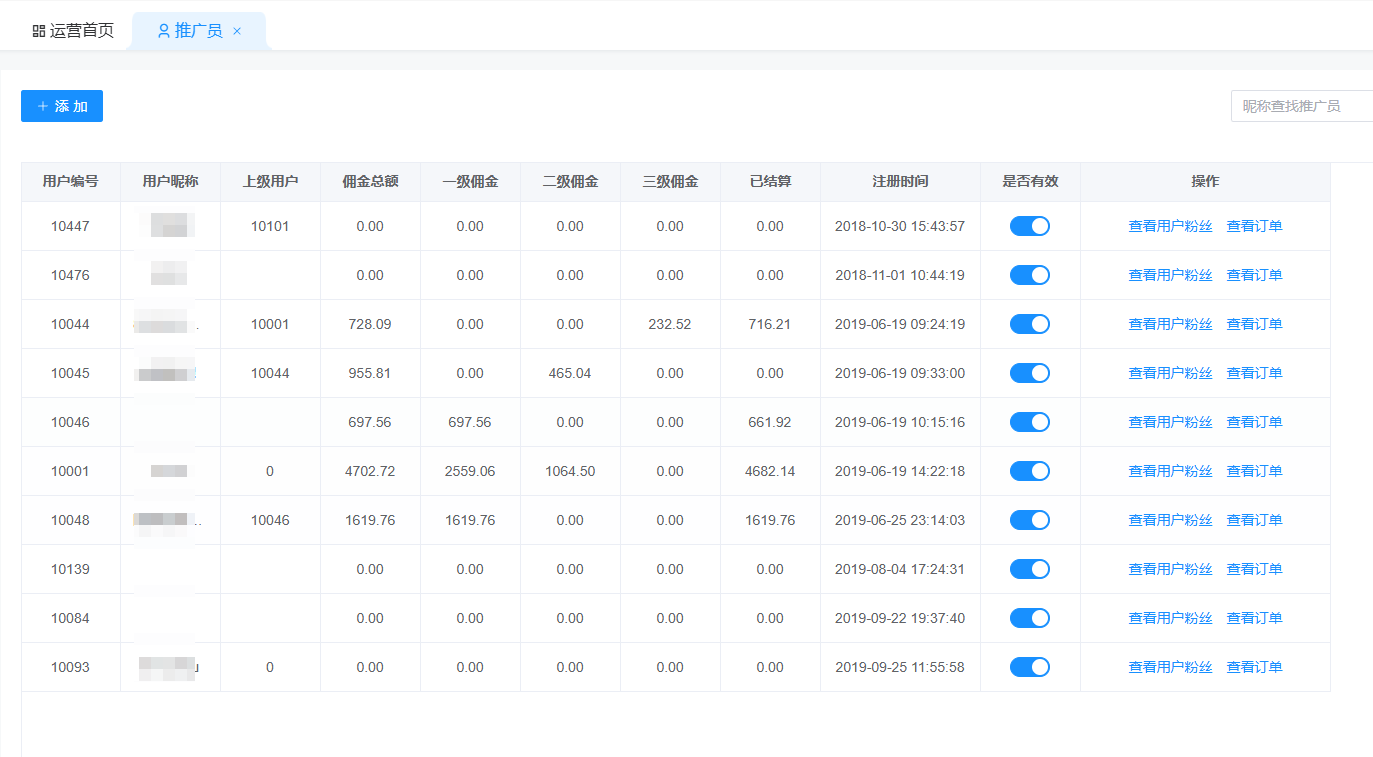 分销功能开启后,所有发展过粉丝的用户在这里显示,可以查看推广员推广的粉丝及粉丝带来的收益。