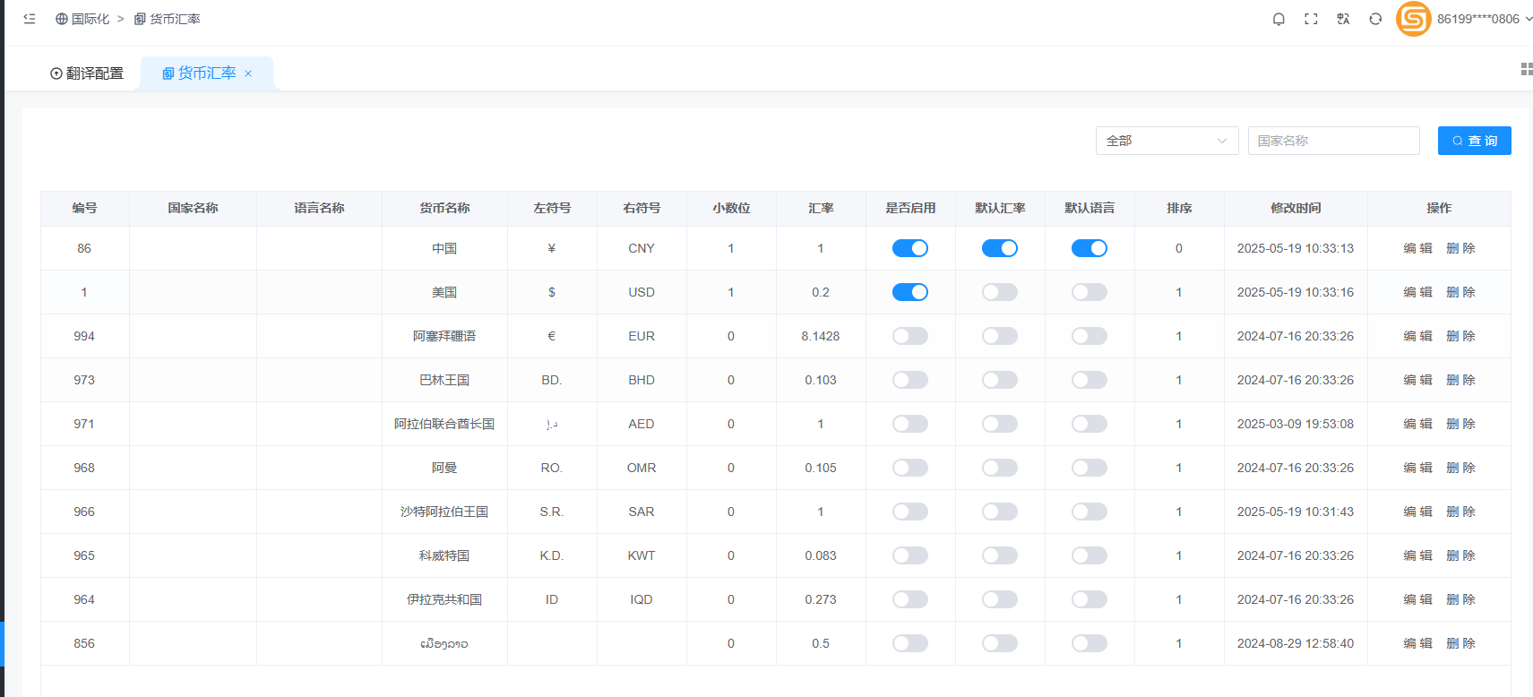 这里设置启用语言和启用对应语言的汇率
