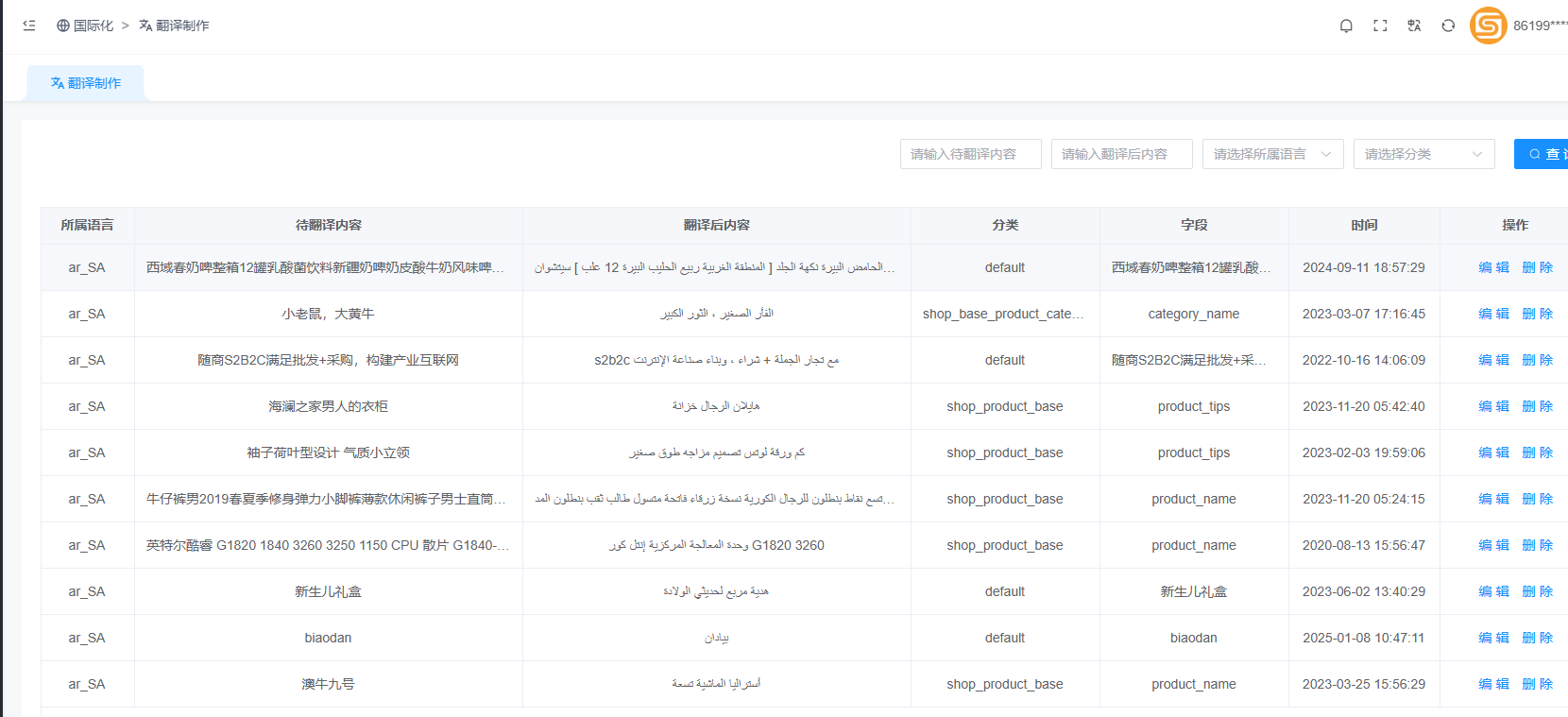 此处的出现的数据是运营中产生的数据,例如发布的商品数据。以中文为基础通过翻译接口自动翻译成其他语言,如果自动翻译的结果错误,可以通过手工修正。