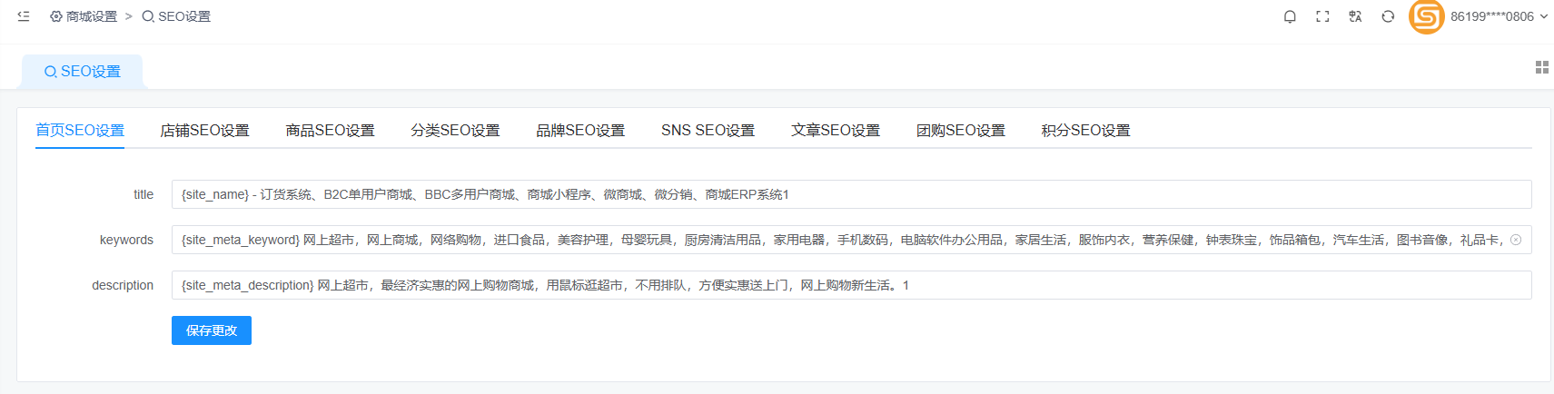 插入的变量必需包括花括号“{}”,当应用范围不支持该变量时,该变量将不会在前台显示(变量后边的分隔符也不会显示),留空为系统默认设置,SEO自定义支持手写。以下是可用SEO变量: