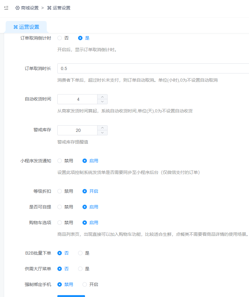 订单取消时长:消费者下单后,超过时长未支付,则订单自动取消。单位(小时),0为不设置自动取消