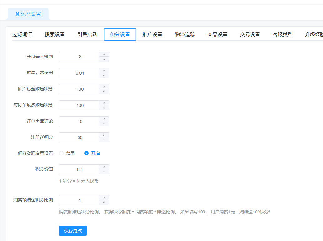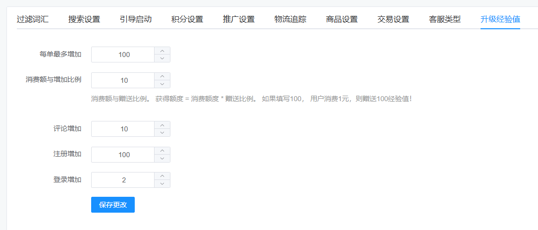 消费额与增加比例:消费额与赠送比例。 获得额度 = 消费额度 * 赠送比例。 如果填写100, 用户消费1元,则赠送100经验值!