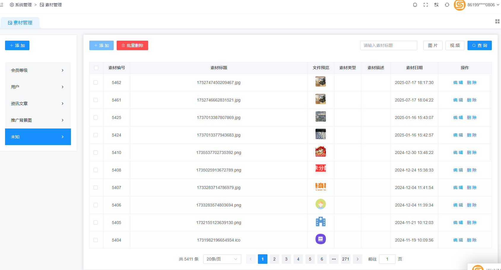平台素材管理,管理后台上传的素材都会集中显示在这里