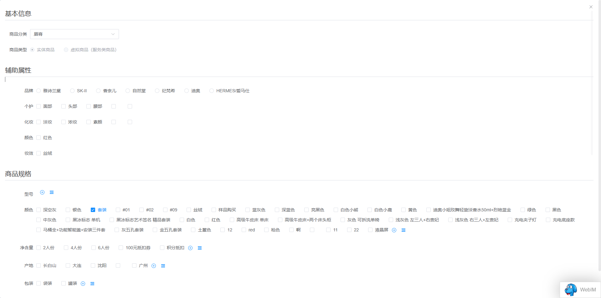 辅助属性:多选项 平台管理员提前设置好的选项,主要用于前端展示筛选使用