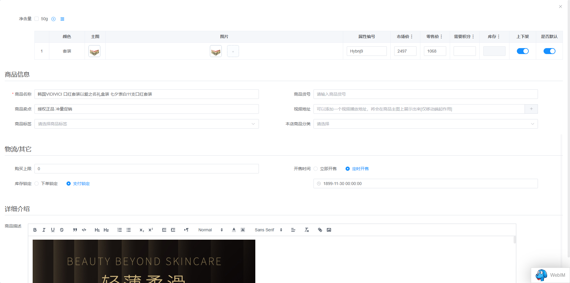 商品描述:编写商品详情(图片宽度800,高度不限制),移动端显示会自适应