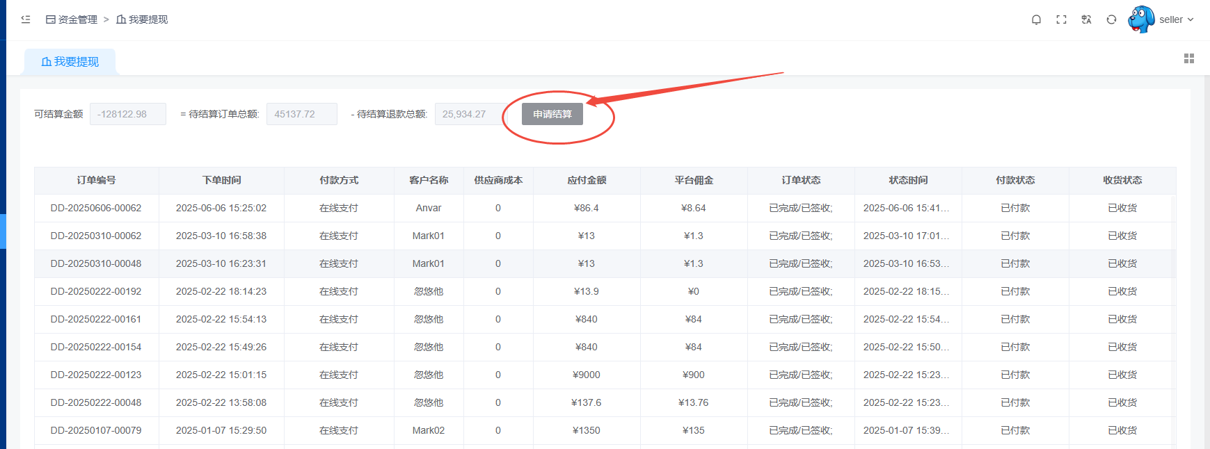 系统会根据交易订单的状态 自动计算可提现金额, 点击 申请计算 进行提现申请