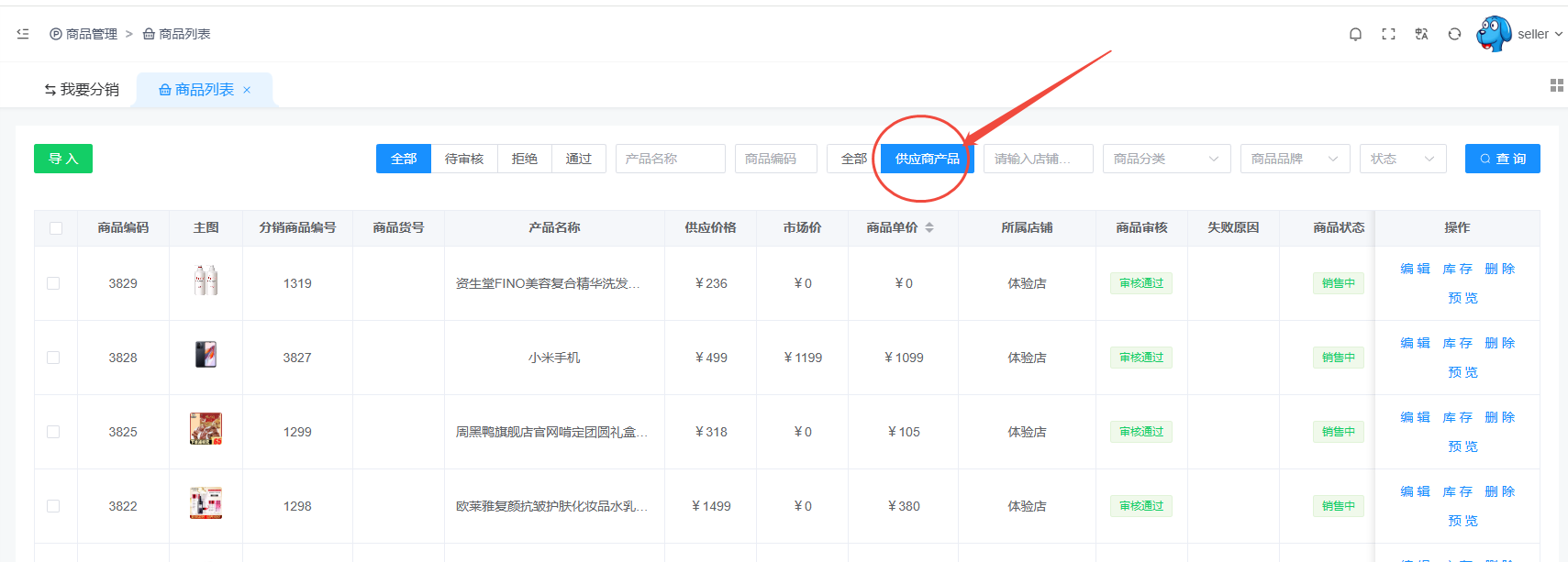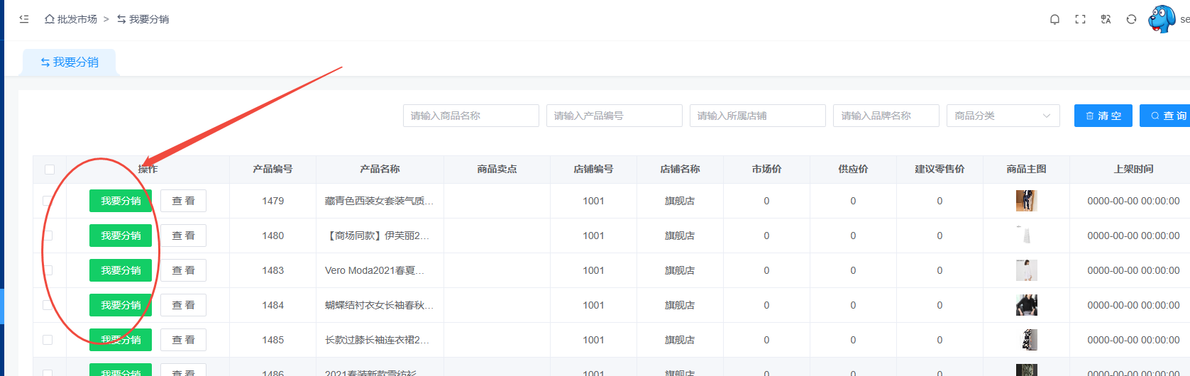 这里显示的是所有供应商发布的商品,如果想分销供应商的商品点击我要分销即可,在商品列表 通过筛选供应商商品 进行修改商品价格售卖。