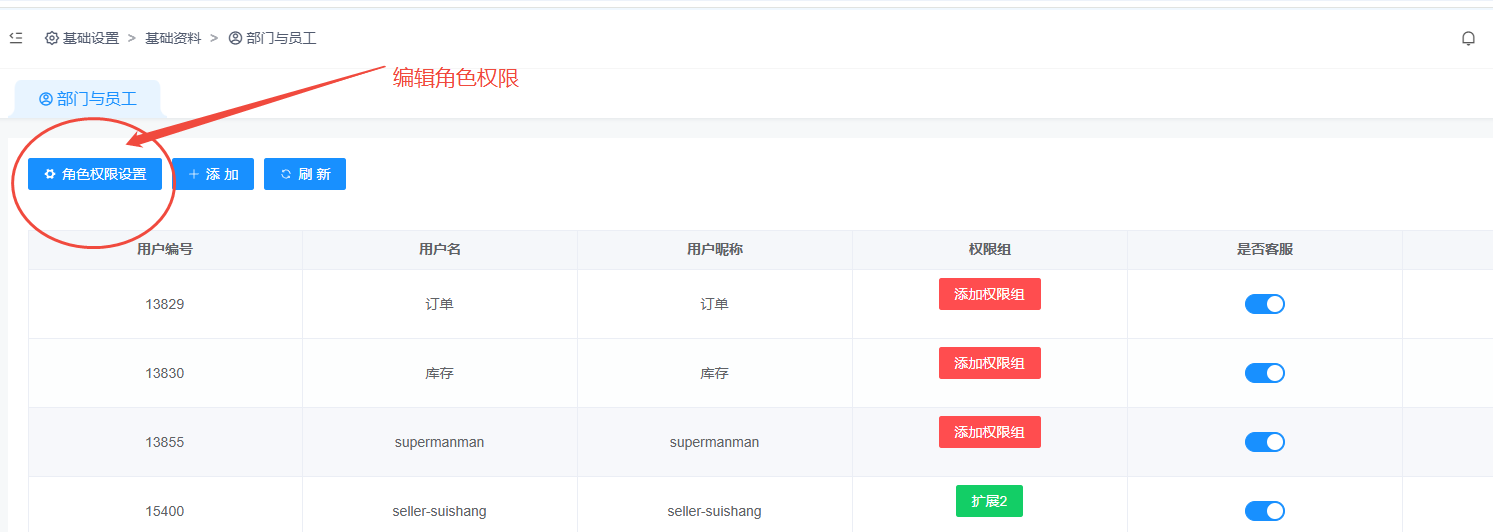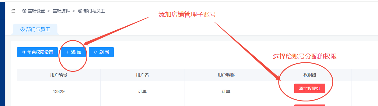 新增编辑员工信息,设置账号密码昵称 设置此店铺的管理权限。